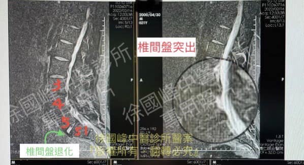 患者自述,本身是一名職業軍人,當時因為運動受傷去一般中醫診所或復健科做治療,沒想到復健3年還是沒好轉自己就很緊張,來門診尋求幫助,當天立刻幫林先生安排核磁共振,發現除了椎間盤退化外還合併椎間盤突出,難怪一走路就非常疼痛。