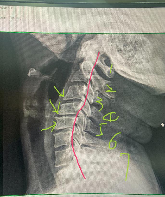 這是一個蠻特殊的案例,很少數的患者頸椎會反弓成這樣,因為一般的復健效果沒有特別好才去大醫院拍攝核磁共振,神經外科醫生建議如果狀況仍然沒有改善,建議置換人工椎間盤