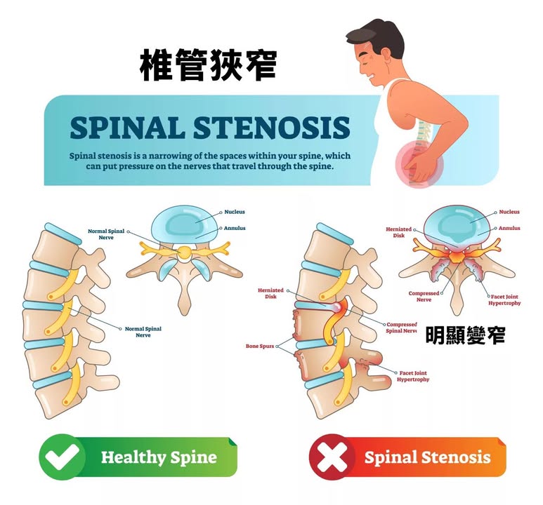 根據中國醫藥大學附設醫院的資料,脊椎狹窄是脊髓腔因腰椎退化造成骨頭及韌帶增生,使得腔室變窄,壓迫其中的神經,產生間歇性跛行或坐骨神經痛的症狀 。