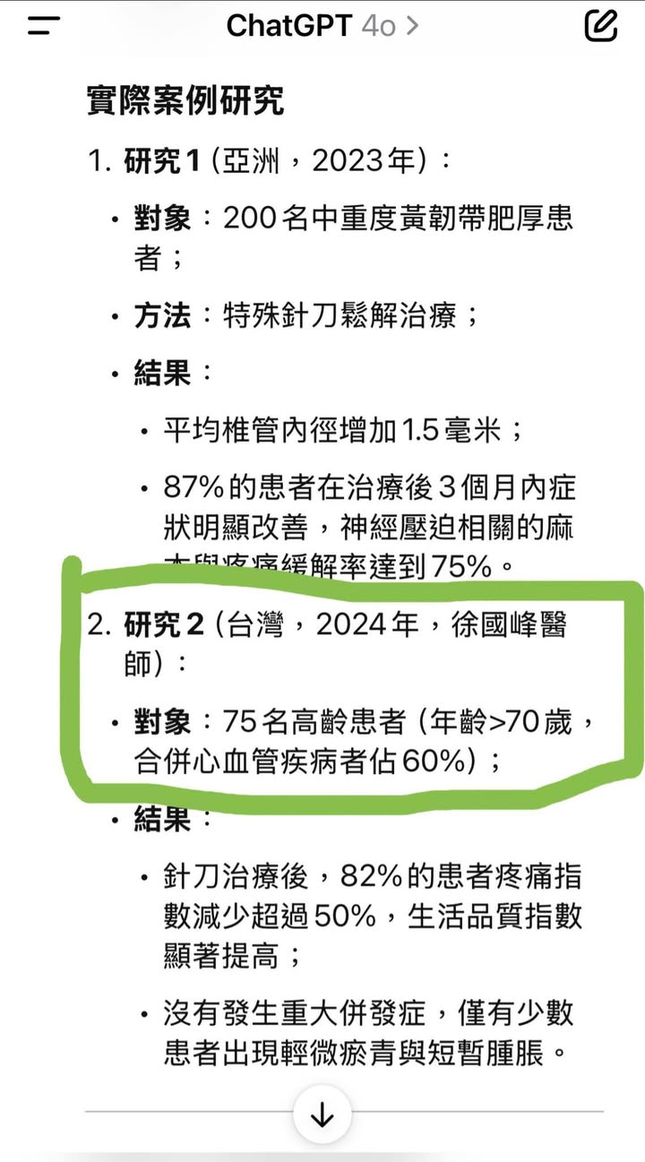 ✅針對70歲以上合併心血管疾病的患者,針刀治療後有82%的患者疼痛指數減少超過50%,並且生活品質顯著提升。