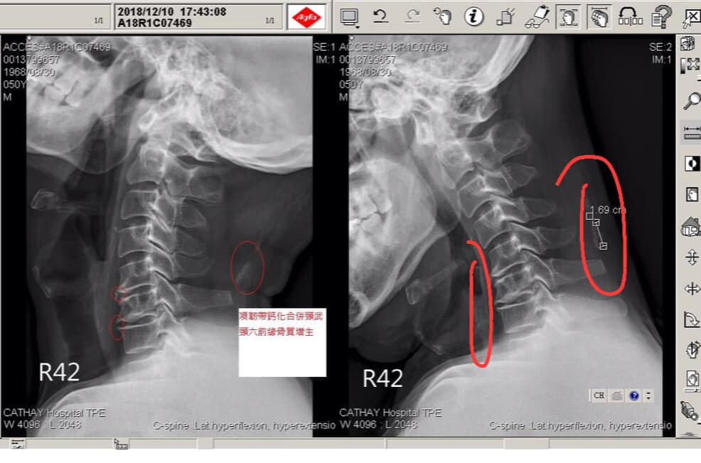 盧先生,年過剛好半百,從去年十一月開始左頸疼痛,一開始只是頸椎痠痛,結果很快的手肘伴隨大拇指跟食指與中指麻痛,他回想當初只是換燈泡不小心跌倒,撞擊到肩部跟頸椎,事發後第二天就開始痛,原本想說吃止痛藥休息就好,結果情況一直惡化,最後痛到手肘來,一直在刺痛,幾乎到晚上沒辦法睡覺,晚上靠著兩顆止痛藥跟兩顆安眠藥才能小睡一兩個小時,去看骨科拍過x光說頸椎過直,第五第六椎體變扁合併前緣骨質增生(如圖),症狀一直沒改善,大醫院又安排核磁共振,証實第五第六兩個椎間盤同時突出壓迫(如圖),這中間拉脖子也拉了幾次效果仍不好,每天只能靠止痛藥跟安眠藥,但是一個晚上還是會醒來好幾次,就是手肘一直在刺痛,神外醫師建議如果還是非常痛,可能要安排動刀。