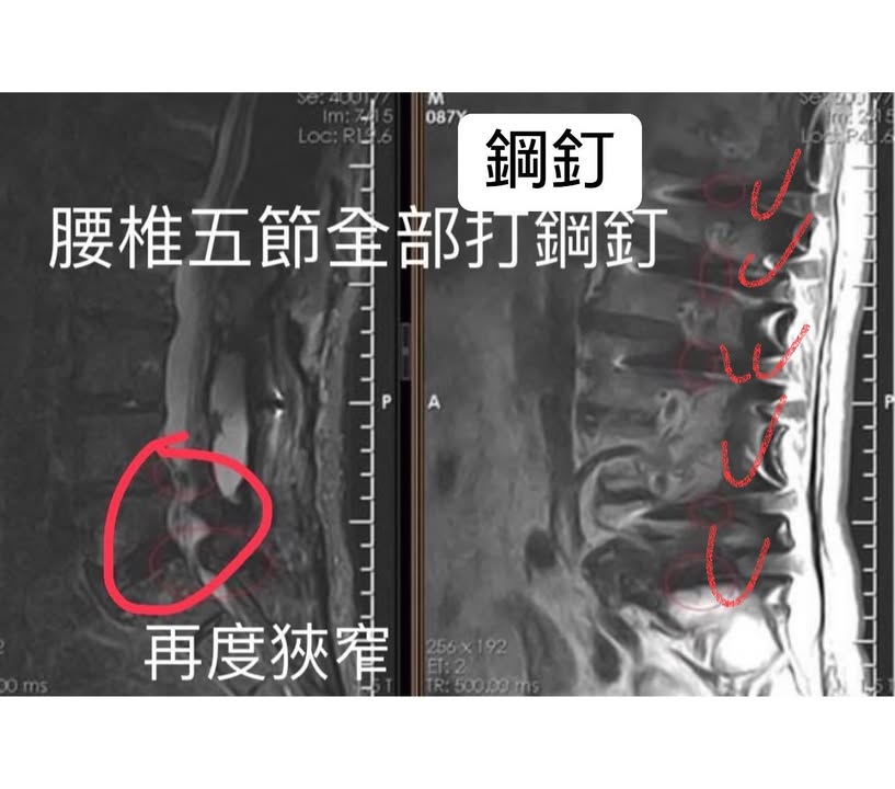 「宜蘭患者,高齡87歲,已經做過腰椎三次手術,每一節全部打鋼釘!這次因為右腳強烈的麻痛,再度安排核磁共振,發現第四節跟第五節的椎間孔再度狹窄⋯⋯⋯⋯」