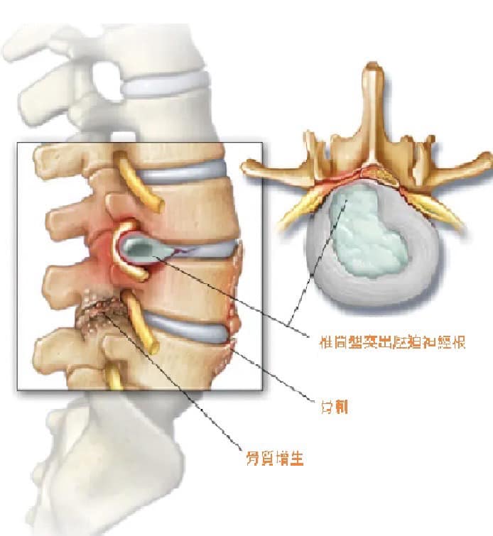 2. 退化造成:保護椎間盤的環狀韌帶逐漸老化、軟化,導致椎間盤向外膨出。
