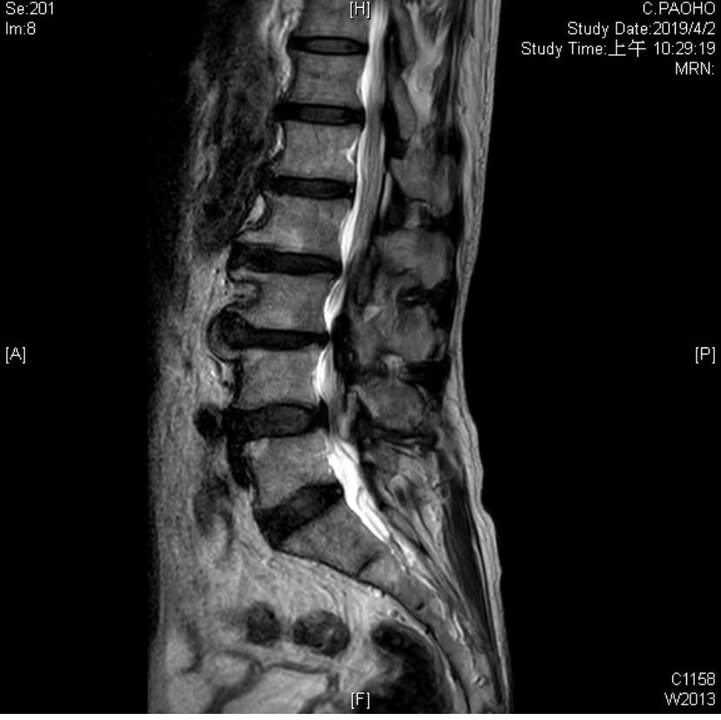 八十多歲的莊伯伯腰痛半年多,抱怨走路大約一個路口五十公尺內就不太舒服,雙腳都麻,坐著不會麻,坐位轉成站位有一股熱氣往大腿後側,腰非常痠痛 ,走路明顯往前彎與傾斜,在高雄大醫院拍過MRI 核磁共振證實腰椎管嚴重狹窄合併椎間盤退化突出壓迫神經(如下圖),看過數個大醫院的醫師都建議開刀!但是老先生心臟問題不穩定且有裝支架,變成醫師不太敢開刀!所以還是保守療法復健為主,但效果就是不好,也不可能天天吃止痛藥吧!經過友人介紹特別從高雄北上接受腰椎整合針刀療法,第一次來門診時老先生很明顯彎腰走路很痛苦,看過片子後又發現老先生的腰椎多裂肌跟腰大肌有萎縮現象,這是一個很難的案例,跟老先生說先安排四次治療如果有改善就走完一整個療程,如果沒改善可能還是開刀為主