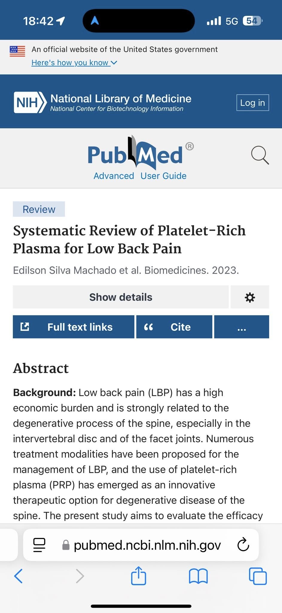 3. Machado ES, et al. Systematic Review of Platelet-Rich Plasma for Low Back Pain. Biomedicines. 2023;11(9):2404. PMCID: PMC10525951