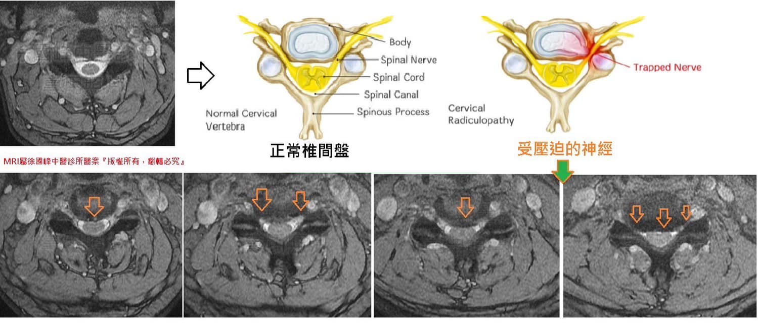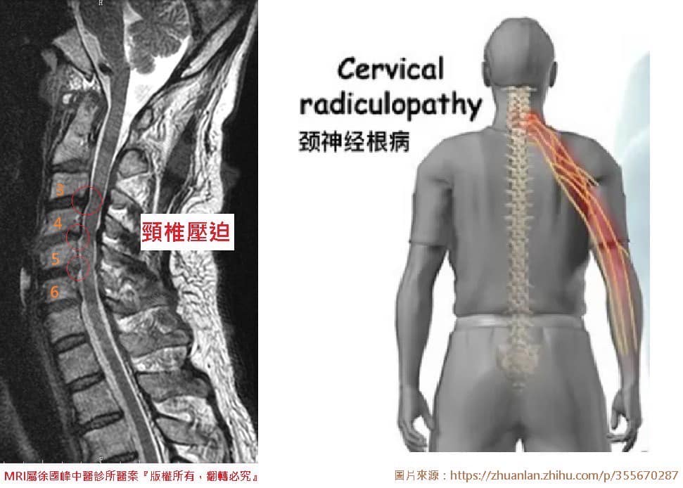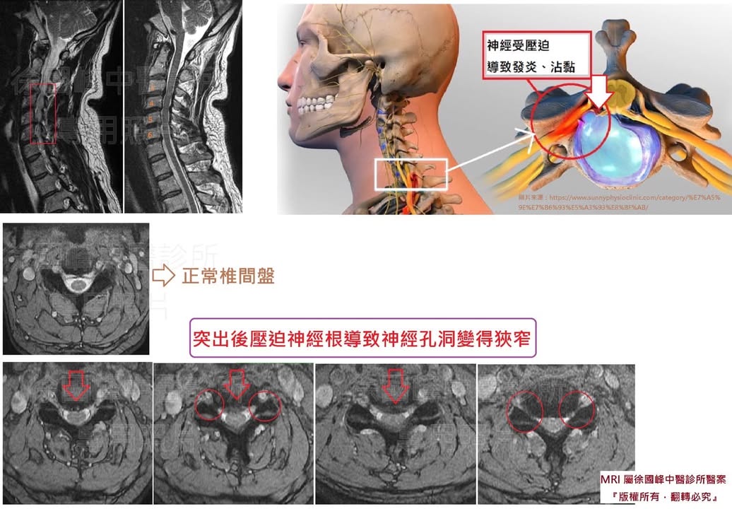 1.頸椎間盤突出->椎間盤因為年齡而失去彈性,加上長期擠壓磨損,導致頸椎間盤收窄或突出,壓迫到神經,引起疼痛