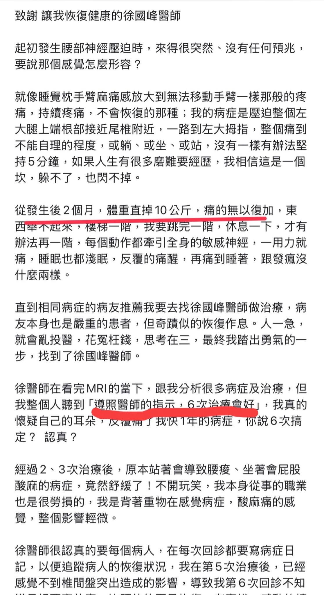 → 回應:我們從未說「所有病人都能六次治癒」,而是這位患者是對位精準、體質反應良好的幸運者。這是可能,但不代表承諾。所有治療皆須依個體差異調整,從未保證療效,也從未斷言唯一選擇;也有患者治療2-3次沒效就選擇其他方法,甚至是在我的建議下去開刀當然都有。