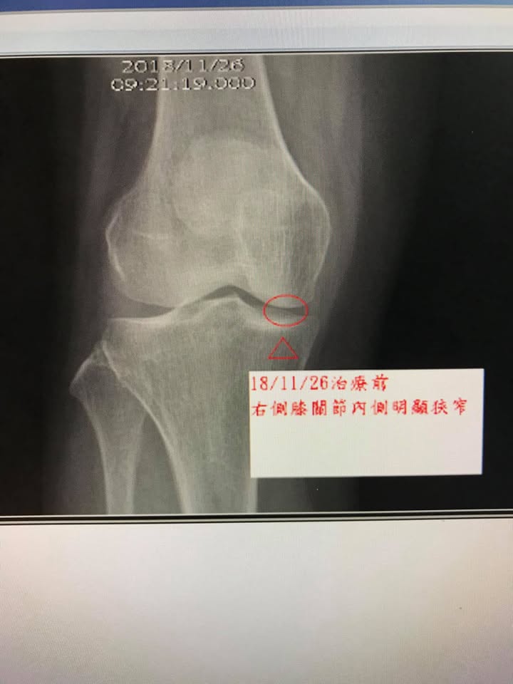 😭游大姊,年約五十多歲,右膝疼痛超過五年,之前在宜蘭當地骨科拍片檢查退化性膝關節炎,症狀如下:走久會痠痛,外側膝蓋很緊,平常膝關節內側明顯刺痛,可以免強蹲下來,上下樓梯很不舒服,特別是下樓梯,都要慢慢扶著欄杆,在當地已經打過波尿酸跟三次自體血小板生長因子,也就是俗稱的PRP,有一點效果,但這幾個月又開始非常痛,在榮總蘇澳分院拍片子檢查發現右側膝關節內側明顯窄縮(如圖)合併左側膝關節臏骨外翻(如圖),經兒子朋友介紹特地來接受膝關節針刀整合治療