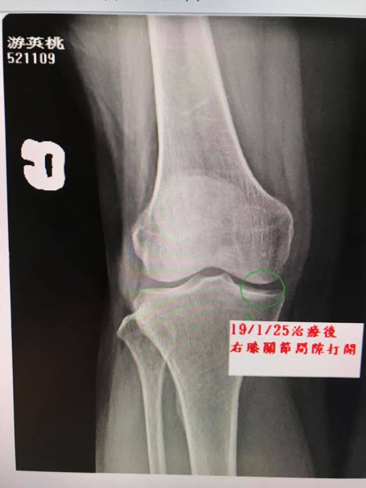 我們非常的開心且訝異,在第二次的治療就感覺膝蓋輕鬆不少,而在八周的治療後,右側膝關節間隙明顯打開,而且原本左側臏骨外翻也改善不少,當然患者臨床症狀大幅度消失,這只是個案報導,並非每個人都有同樣效果,囑咐游大姊還是要常訓練股四頭肌跟避免久蹲久站等會傷害膝關節的動作