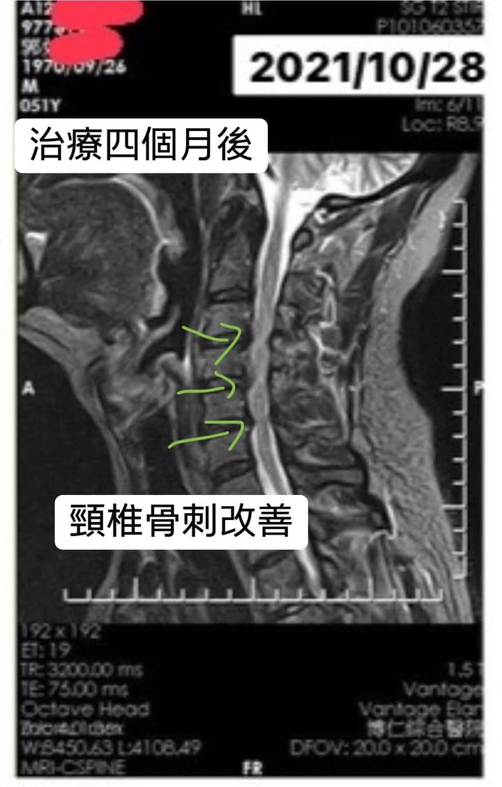 第六次治療後,雙側上肢變得輕鬆,之後肩膀麻痛一直都有改善,治療一個多月後,麻痛幾乎消失六七成,一直到今年十月發現手已經完全沒有任何麻痛症狀了,再度安排MRI比較前後差異,發現骨刺有吸收一些的現象