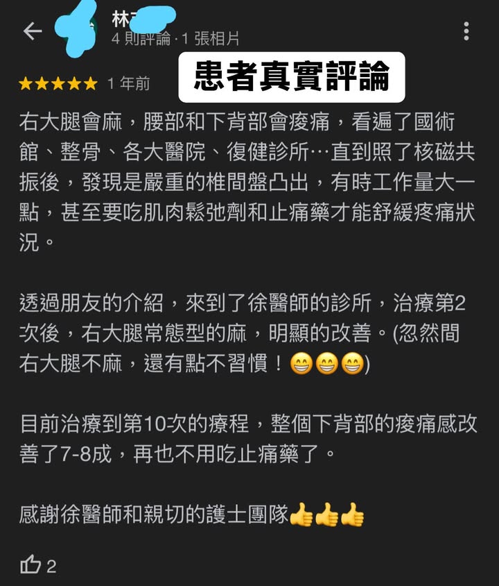 透過朋友的介紹,來到了徐醫師的診所,治療第2次後,右大腿常態型的麻,明顯的改善。(忽然間右大腿不麻,還有點不習慣!😁😁😁)
