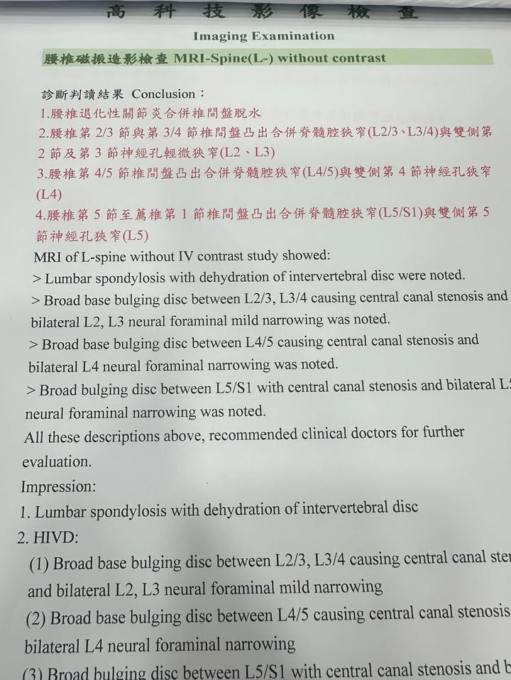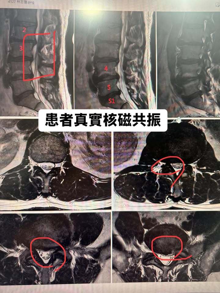 2023年7月7日,他終於鼓起勇氣,來到了脊椎針刀專科門診,懷著既期待又忐忑的心情諮詢。醫療團隊細心地了解他的病史,並安排了詳細的檢查。當拿到核磁共振報告時,醫師凝重地告訴他,腰椎的第二節、第三節、第四節及第五節都出現了神經孔狹窄,神經受壓的情況很明顯。聽到這些,林先生的心一沉,擔心自己是否必須開刀治療。