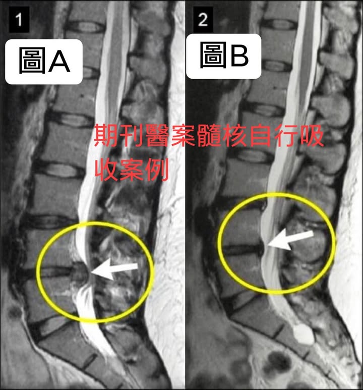 期刊中提到一名29女性因為嚴重腰痛跟腿痛就醫!她的腰椎核磁共振成像(MRI)顯示腰椎間盤巨大突出,導致實質椎管狹窄和神經根壓迫(圖A)。她選擇了保守療法物理治療,在短短5個月後第二次核磁共振成像顯示髓核有明顯吸收(圖B)