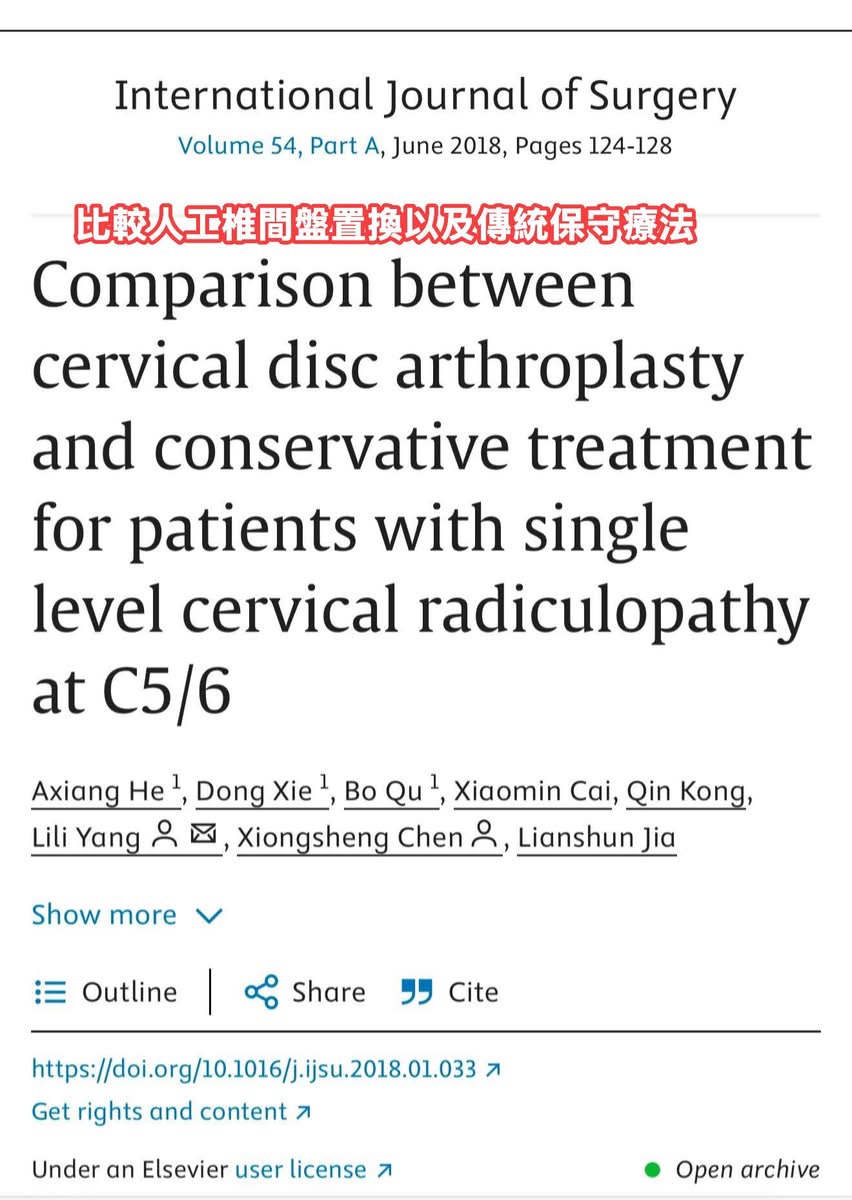 Volume 54, Part A, June 2018, Pages 124-128 ,2018發表一篇研究對比人工椎間盤手術與保守療法,特別是最常見的第五頸椎跟第六頸椎。