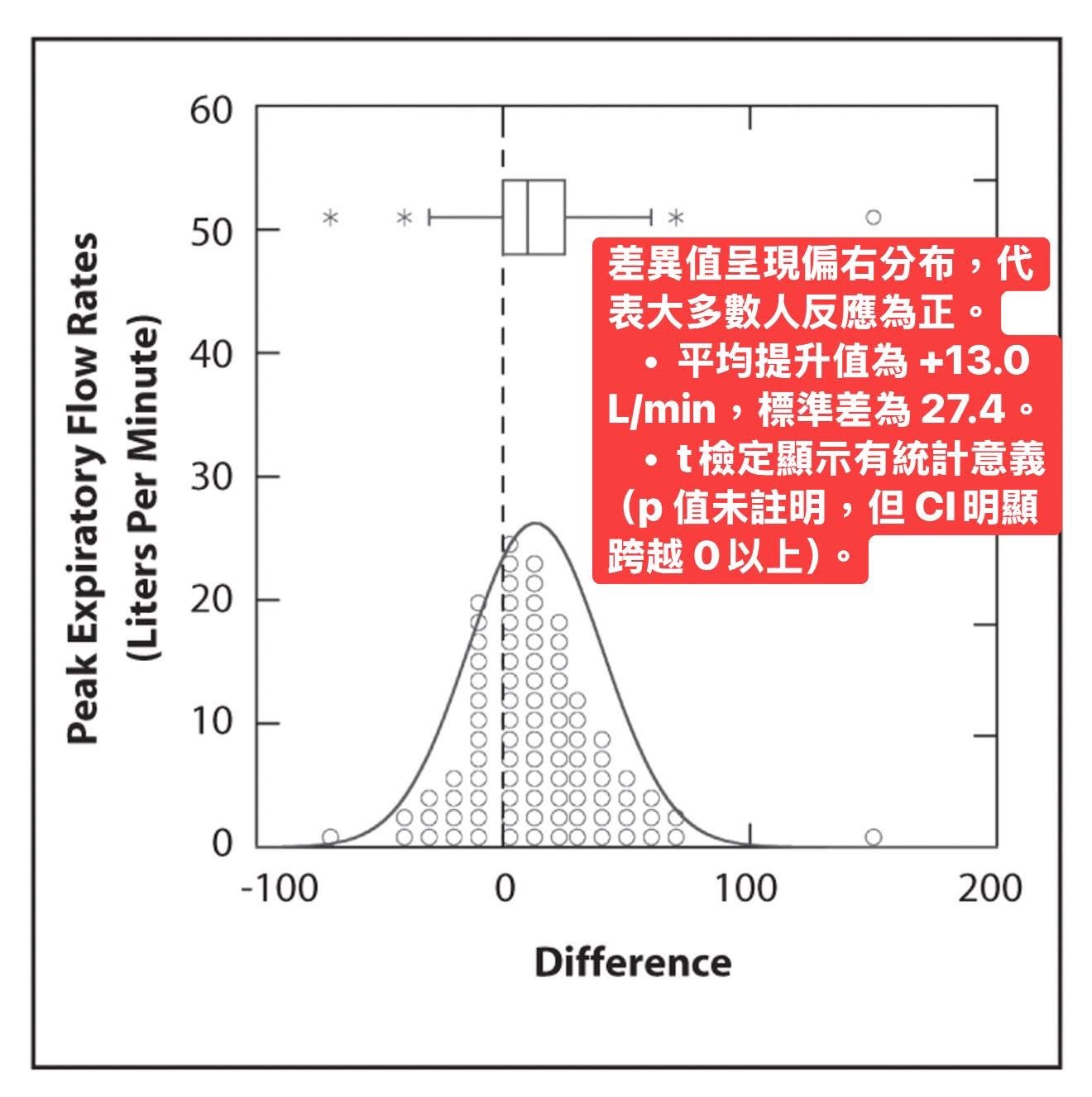• 圖中的 大部分小圓點集中在正數那邊,代表 大多數人都有進步。