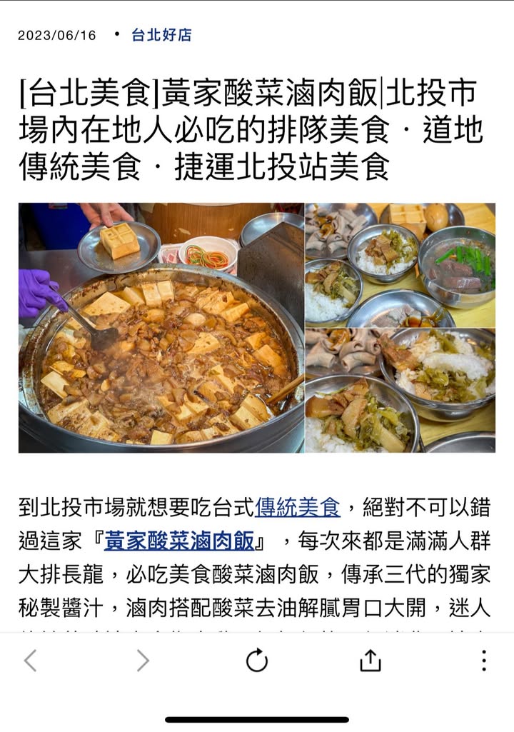 患者聽說我喜歡吃滷肉飯,特別排隊去買北投黃家酸菜滷肉飯,聽說傳承三代!飄香六十年,香噴噴秘製醬汁,首次吃到酸菜為第二角色,去油解膩 ,很特殊的風味。