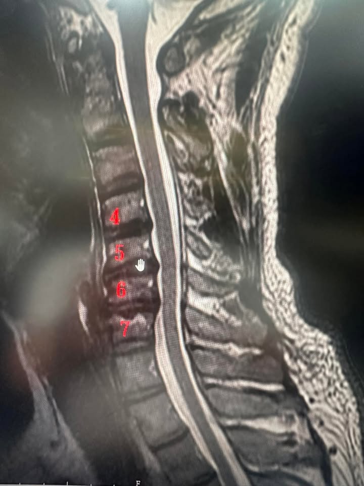 🟡MRI判讀:這張影像是頸椎的磁振造影(MRI),顯示了頸椎的側面觀。圖中標示了第4、5、6、7節頸椎(C4、C5、C6、C7)。