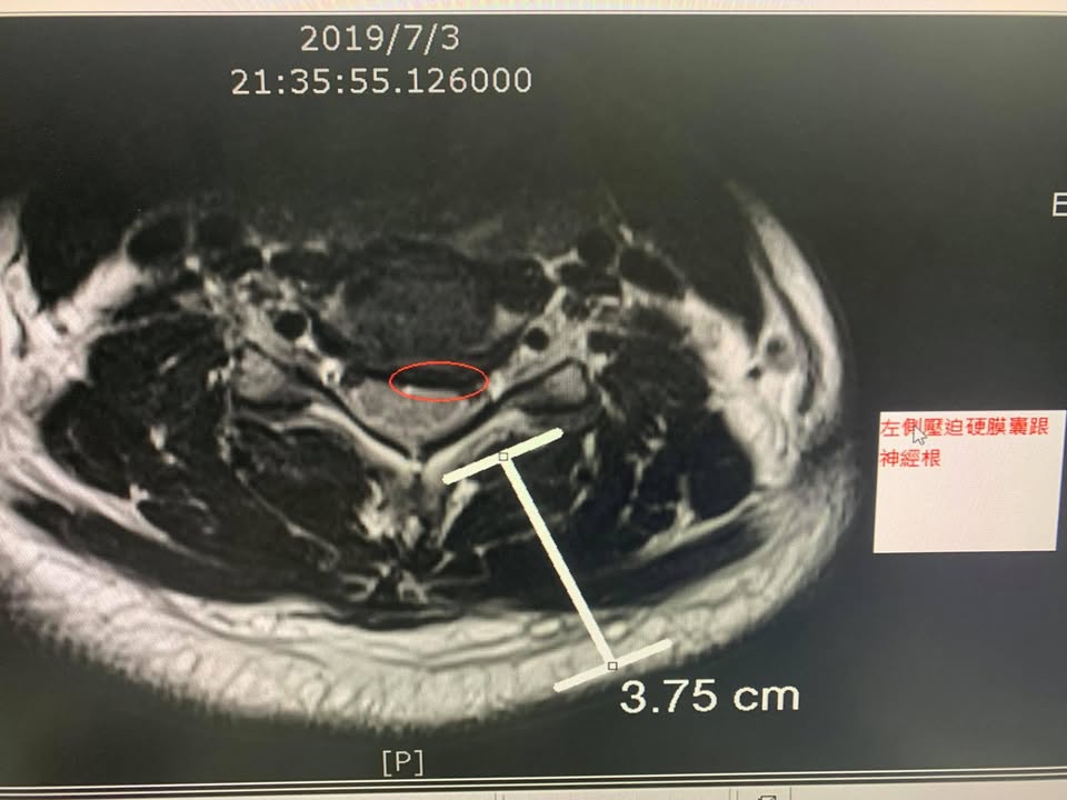 😢雲林來的戴小姐抱怨肩頸疼痛,右側最痛,右邊上臂疼痛,晚上睡覺非常痛,復健拉脖子稍微改善,但是一直都沒辦法明顯改善,後來在今年七月三號去某醫學中心拍攝頸椎核磁共振證實頸椎第五神經根卡壓,兩個醫學中心的骨科醫師都建議開刀,因為傳統復健超過三個月仍然沒重大改善,頸椎酸痛到上臂都非常不舒服,經過先生介紹特別從雲林縣斗六市北上就醫