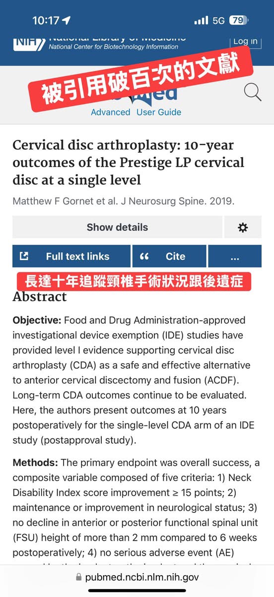 • 根據《Spine Journal》的 10 年隨訪研究,人工椎間盤的再手術率約 7–14%,異位鈣化比例甚至超過 30%。