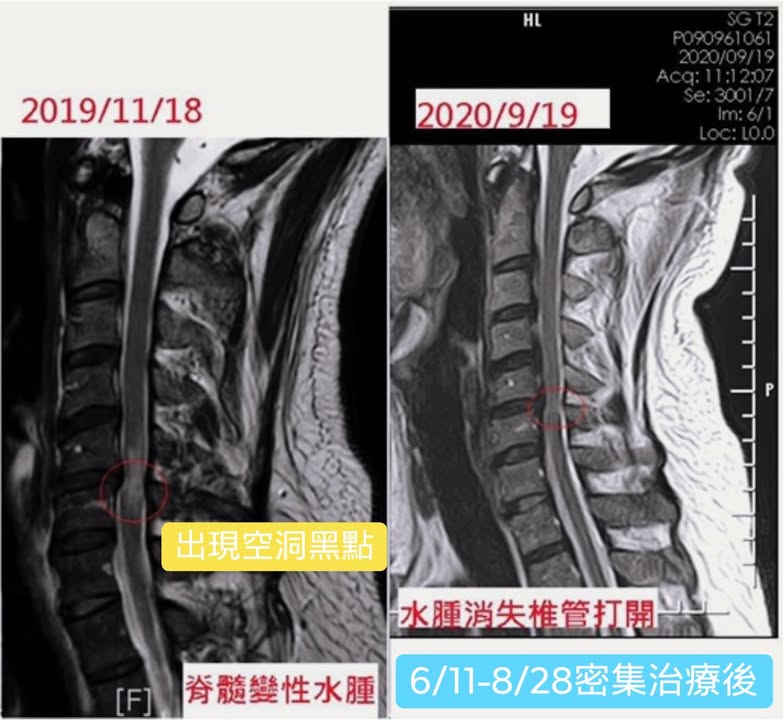 ㊗️治療結果:我們從今年六月十一號治療到八月二十八號,總共治療十五次,之後在今年的九月十九號安排mri,已同一張正中矢狀切面來比較,發現水腫部分已經幾乎消失,後面椎管也打開一點點,更重要的是左腳症狀幾乎完全跟以前一樣,腿的力量完全恢復,可以跑起來,也可以剎車!頭往後仰也再沒被電到