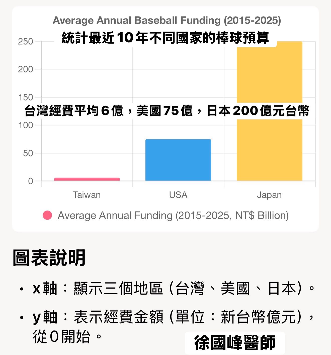 說穿了,這背後是政府和政治結構的問題。我們的體育預算少,長年來,台灣體育經費超低,以下圖表顯示台灣、美國、日本過去這十年的棒球經費,台灣6億元(5-7億平均值);美國:75億元(60-90億平均值);日本:250億元(200-300億平均值),也就是說我們預算只有日本的3%,美國的8%,那其他的錢呢?我相信更多錢拿去搞短期「國際賽備戰」;此外,醫療缺席!在美日,青少年棒球隊很早時期都有隨隊醫師;在台灣,很後來才有這個制度,而且通常要痛到不行才被送醫院。