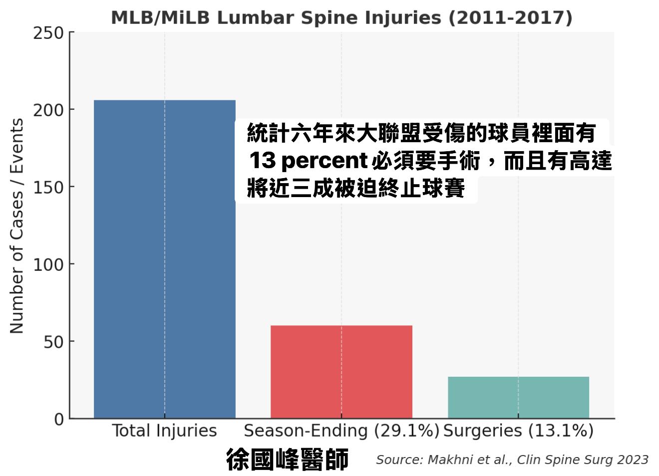Makhni (2023, Clin Spine Surg):MLB/MiLB 2011–2017 年,腰椎傷病 206 起,累計缺賽 5,948 天;29.1% 直接球季報銷,13.1% 需要手術。