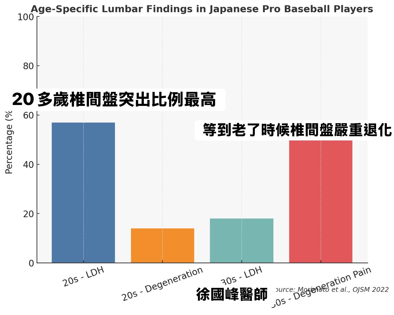 Morimoto (2022, OJSM):日本職棒球員,20 歲最常見的是椎間盤突出(57%);30 歲開始換成退化性椎間盤痛(55%)。MRI 顯示:30 歲退化率 91%,20 歲僅 14%。