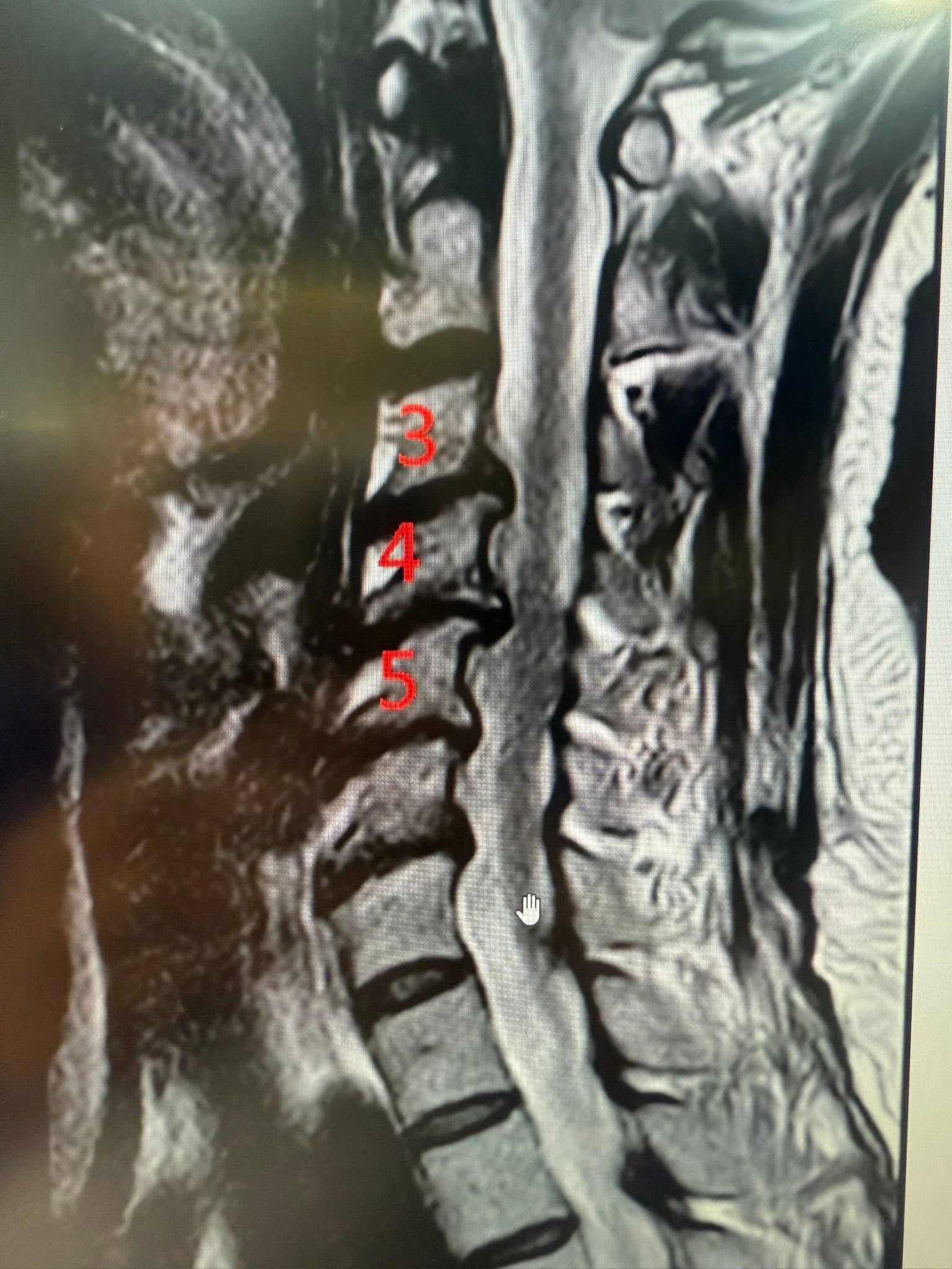 • MRI則清楚看見C4/5、C5/6、C6/C三節都椎間盤突出,C5/6明顯壓迫脊髓與左側神經根