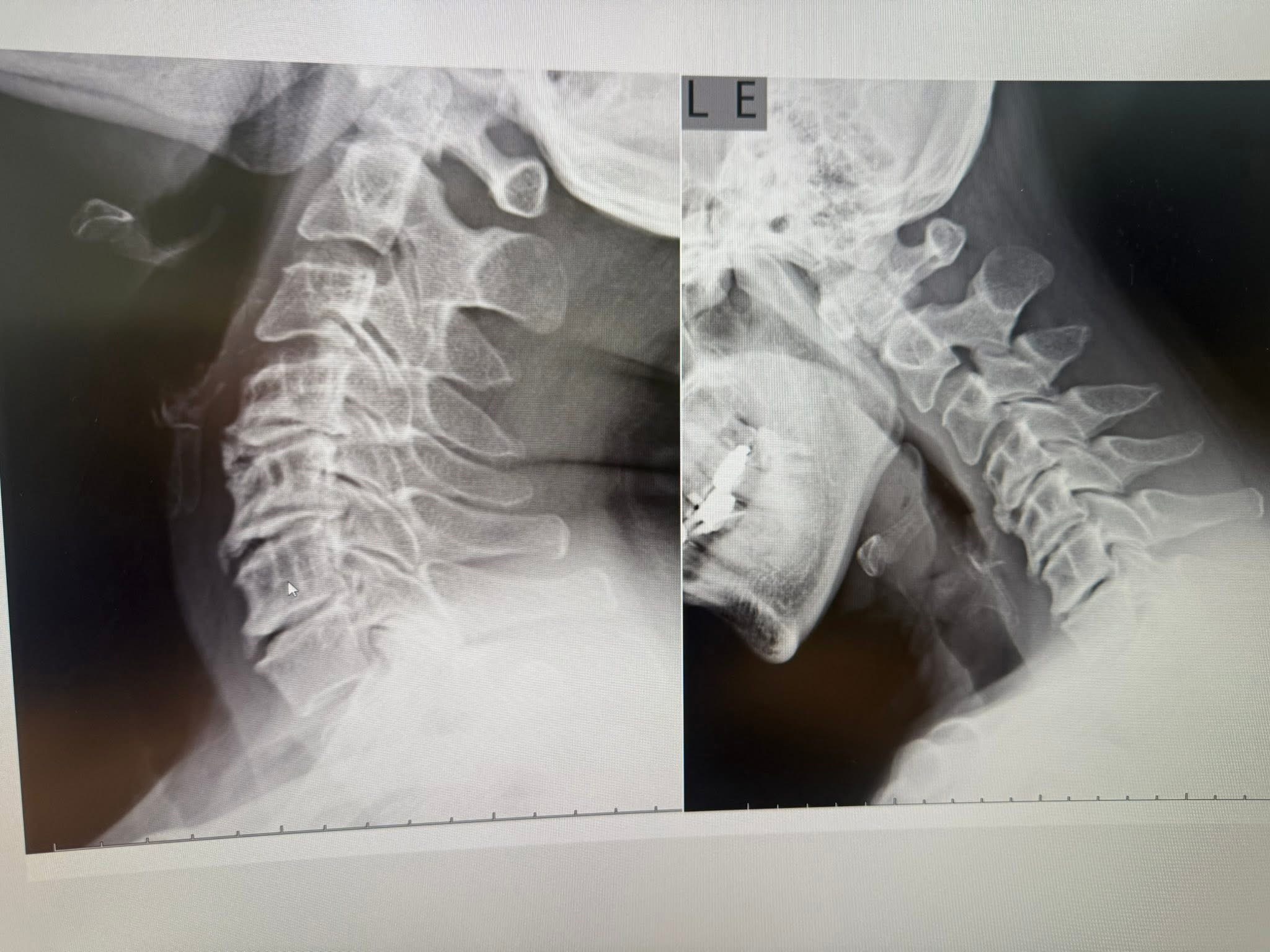 • X光顯示頸椎生理弧度變直,C5–C6不穩,前彎活動受限
