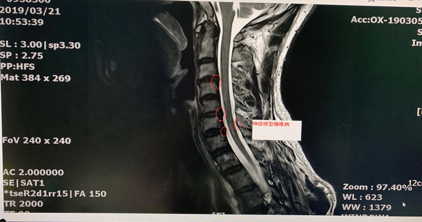 宜蘭的于大哥抱怨左邊頸痛連肩膀,大約半年,頭往後抬最明顯,會有明顯上臂麻痛感,之前長期是衝浪愛好者,需要密集使用頸部肌肉群,一開始只是肩膀痠痛,後來發現衝浪抬頭整條手臂就開始麻痛才覺得不對勁,之前嘗試貼過草藥有一點效果,但是一直沒有重大改善,去當地的醫學中心接受頸椎mri核磁共振照影顯示頸椎間盤輕微突出導致神經根卡壓(如圖),經過衝浪客介紹特地北上接受頸椎整合中醫微創療法,非常幸運四次效果就很明顯,這中間去衝浪發現手的麻痛感大幅度降低,非常開心,這次治療好徐醫師提醒頸部跟肩膀肌肉要適時放鬆跟強化頸部深層肌肉的力量才不會再度復發