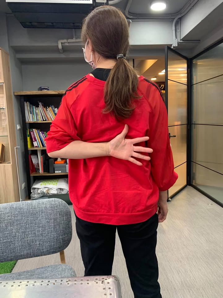 淡水蔡阿姨因為之前的一場車禍,導致肩膀受傷,疼痛時間快三年,在某大醫學中心做過震波治療三次,也施打過玻尿酸三次,上述方法大約改善阿姨五成的疼痛跟角度,但是後伸摸背角度大約還在皮帶附近,來診前大約上舉在120-130度,由於剩下的五成一直沒有重大突破,而且天氣變冷側睡還是會痛,經過女兒介紹來接受肩關節整合中醫微創療法