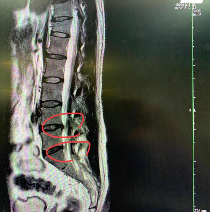 林先生抱怨腰椎疼痛一年多了!之前舊傷從大車滑倒跌落下來撞到導致受傷 ,屁股跟小腿腿肚非常刺痛跟麻痛,以下是做過的治療:傳統針灸..電療...熱療......,以上都是健保治療,所以去好幾個療程,進步很少,想說自費去打PRP(自體血小板生長因子),RRP在台北市診所行情一劑15000,在醫院比較貴會到20000~25000,還打了三次阿,花費不少,根據林先生說法這幾年在治療腰椎花超過快二十萬,後來又在瑞芳小診所打了超過10次消炎止痛針,問題是每次都好一天,隔天開車送貨清運搬東西就開始痛, 整天不定時抽痛,來診前的症狀如下:久站跟走路超過5分鐘開始痛,往後仰跟打噴嚏與咳嗽痛到哀號連連,人生好苦,莫過於開車開不下去~~重點是林先生的職業就是專業開車,每天要開十幾個小時,開車很痛代表他可能無法工作,這對全家經濟命脈都維繫在他身上的林先生很是沉重,這次拿著2019年11月底的核磁共振來接受門診諮詢