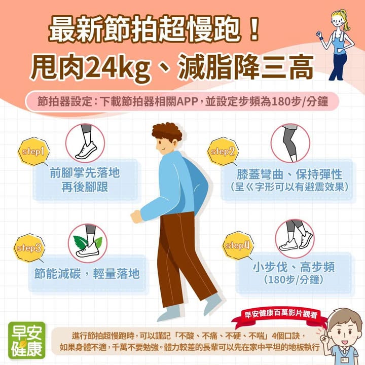 搭配節拍器設定180步頻來練跑,穩定心律、不會忽快忽慢,心跳穩定,跑起來就會舒服,也才能跑的久,對於減重減脂、降三高有幫助。