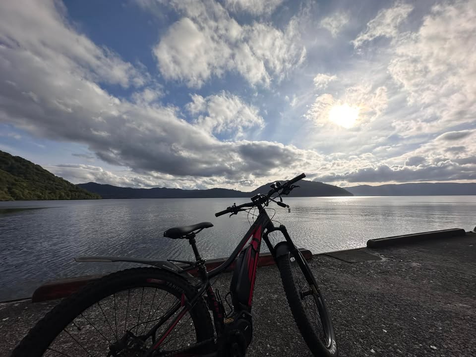 中間最高最低落差將近300公尺,也就是100層樓,從飯店騎過來到這邊的長度大概13公里,沿途的溫度大約在10度左右,湖光山色美不勝收,大老遠從飛過來為了這個景色!真的有放鬆到