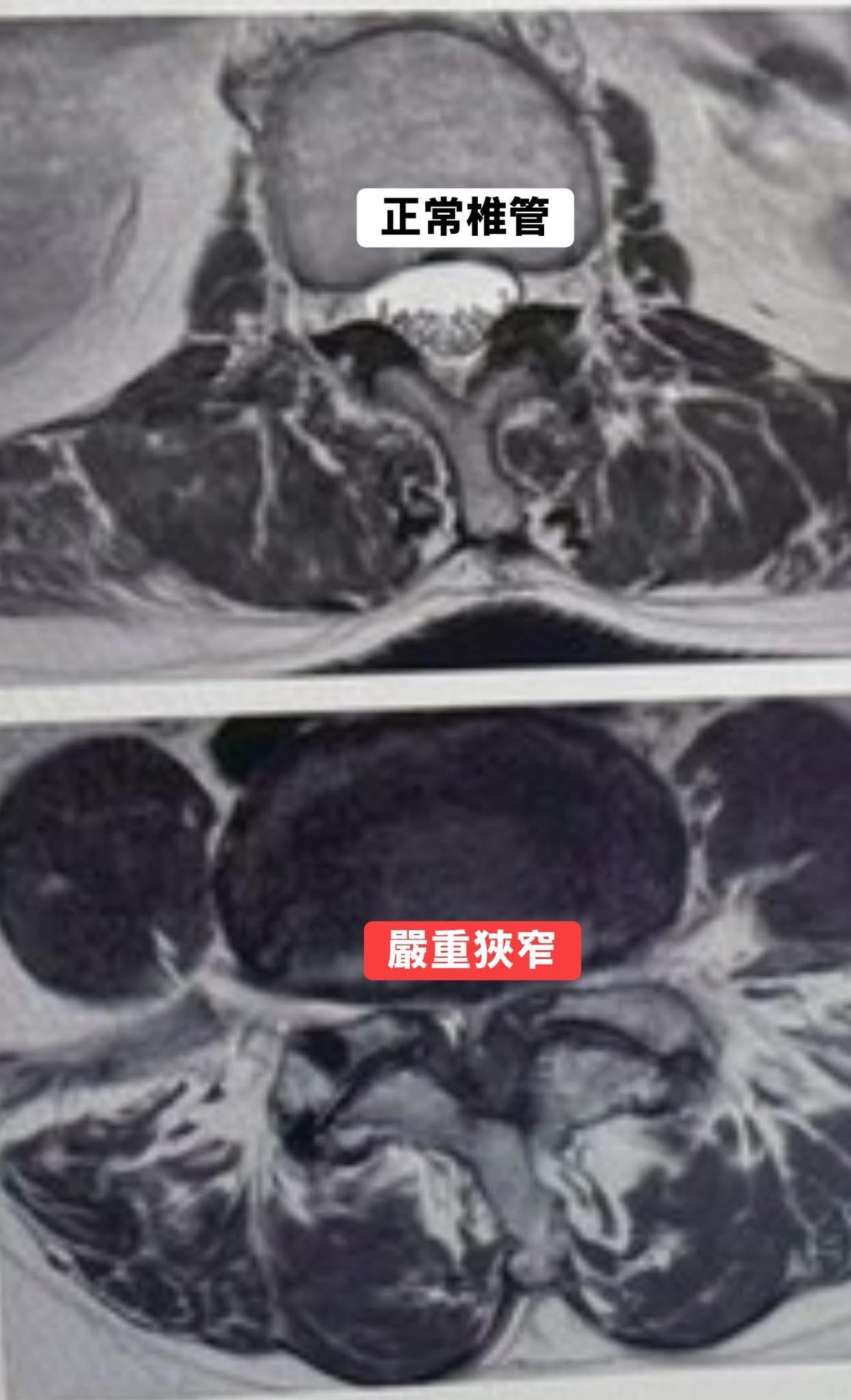 蔡阿姨患的是典型的腰椎管狹窄症(Lumbar Spinal Stenosis, LSS)這是一種隨著年齡增長,脊椎退化導致神經通道變窄的病症。對阿姨來說,這不僅是影像上的數據,更是活生生的折磨: