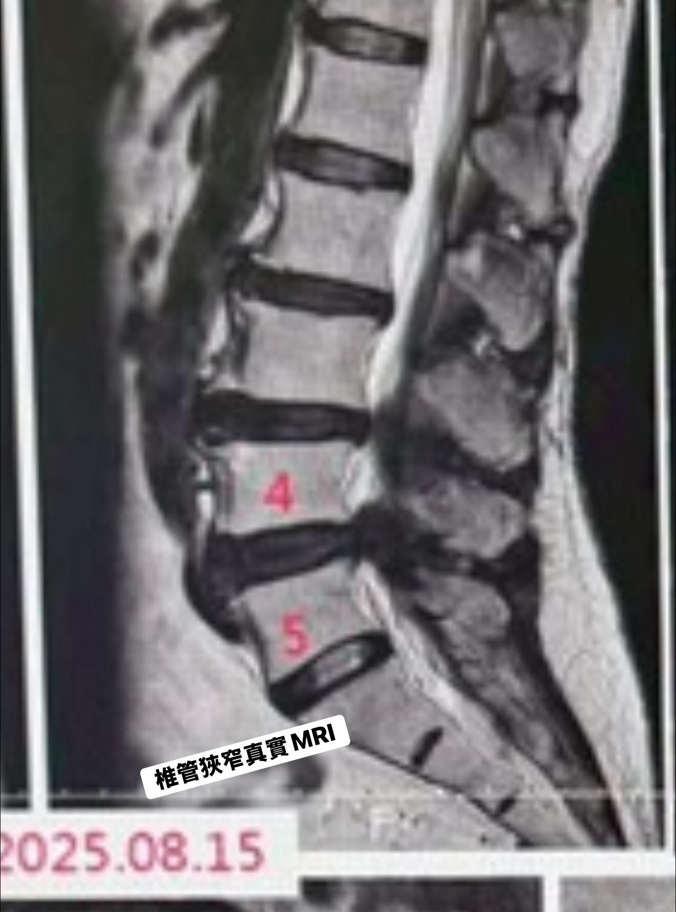 我看著她的 MRI 照片(2025.08.15),心中暗自抽了一口氣。L3/L4、L4/L5、連續兩節的重度狹窄!脊髓腔被肥厚的黃韌帶與退化的骨刺擠壓到幾乎變形。在傳統西醫的觀點裡,這幾乎只有「動大刀、打鋼釘」一條路。但 76 歲的高齡,手術風險、麻醉風險、漫長的臥床期,對阿姨和家屬來說,都是一場不敢豪賭的冒險。