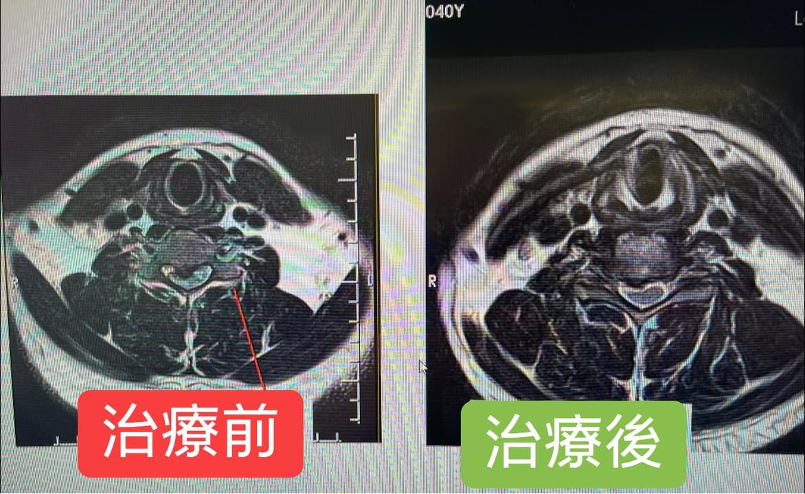 第五次治療後,雙側上肢變得輕鬆,腳走路明顯靈活許多,麻痛幾乎消失六七成,連溫度感覺也回來了,一直到今年十一月底月發現症狀幾乎完全消失,再度安排MRI比較前後差異,發現骨刺有明顯吸收現象