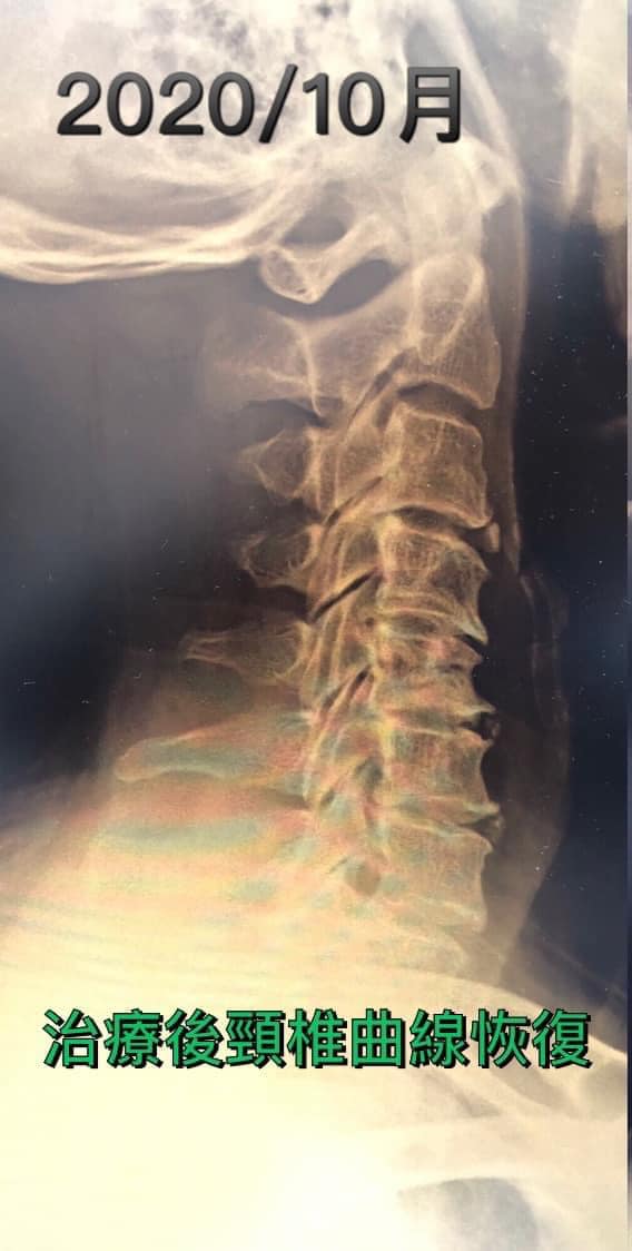他非常認真的接受微針減壓療法!更重要的是他卯起來做毛巾操跟收下巴運動,每天超過五百次以上,堅持了兩個多月,看到令人感動的片子,可以說頸椎反弓現象消失了,當然患者臨床症狀也改善很多。
