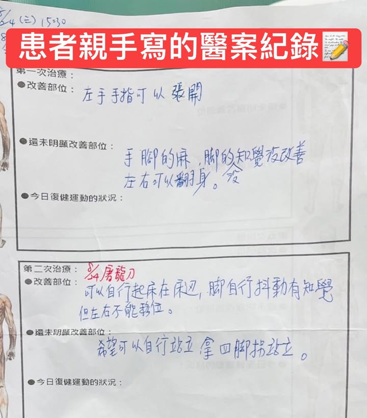 沒想到針第一次後,患者表示左手握力增加,之前左手完全沒力,連張開動作都無法,針到第二次後,居然患者可以自行地在床邊緩慢站起來,雙腳恢復知覺!!!
