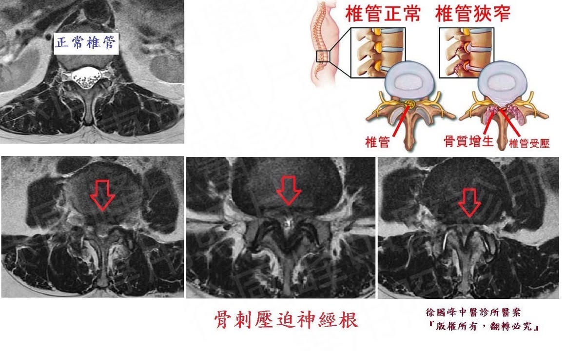 一般來說,單純的脊椎狹窄壓迫神經,是因為長期彎腰導致脊椎兩旁的黃韌帶(ligamentum flavum)肥厚增生進而壓迫到神經,只要未伴隨脊柱嚴重滑脫,通常只要將黃韌帶減壓,讓神經不再受到壓迫即可,之後訓練患者核心肌群,讓筋膜當作自己的最強骨架,原則上開刀是最後最後要選的路。