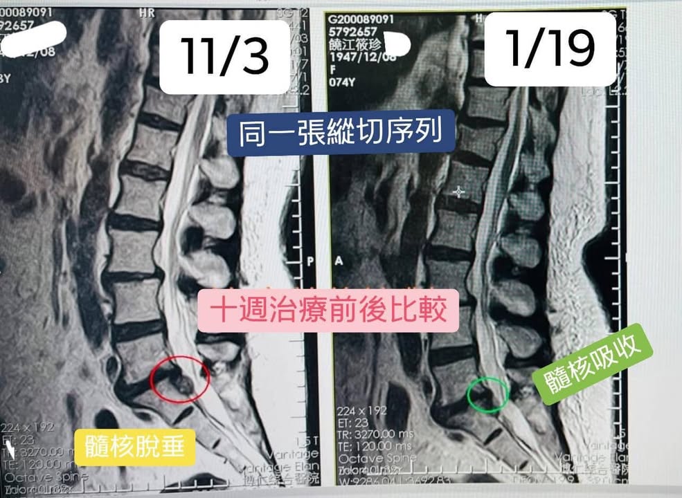 ‼️巨大椎間盤突出脫垂大痛到無法走進診間 ★醫學中心神外醫師認為可能要開刀 ㊣脊椎整合中醫微創逆轉勝成功 ▲十週耐心治療之後再安排一次MRI #微針刀減壓確實看到影像吸收效果 #感謝台北市內湖區饒奶奶熱情見證