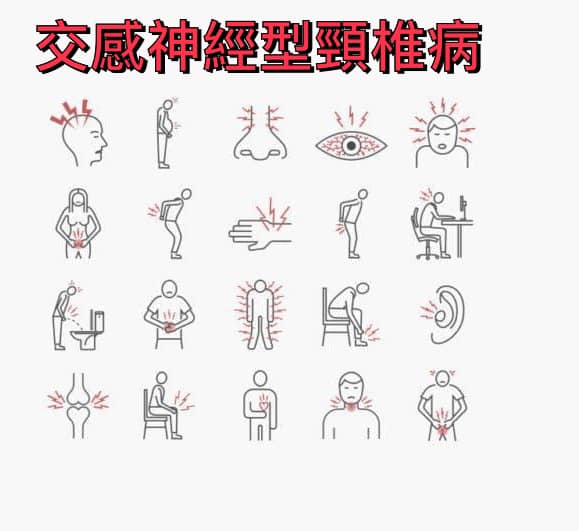 一般而言,最「典型」的頸椎並是神經根型頸椎病,也就是「壓迫」造成手麻手痛、或壓迫脊髓造成步態不穩等「典型症狀」;但頸椎病患者常會表現出許多「非典型」的「交感神經受到激惹」的症狀,包括頭痛、眩暈、耳鳴、視力模糊、心悸、胸悶、腸胃不適、泌尿失常等「全身上下、裡裡外外、從皮到骨、五臟六腑」的不舒服。