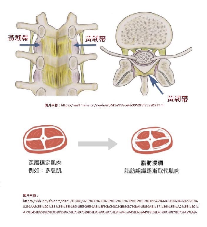 👉一般來說,單純的脊椎狹窄壓迫神經,是因為長期彎腰導致脊椎兩旁的黃韌帶(ligamentum flavum)肥厚增生進而壓迫到神經,只要未伴隨脊柱嚴重滑脫,通常只要將黃韌帶減壓,讓神經不再受到壓迫即可,之後訓練患者核心肌群,讓筋膜當作自己的最強骨架,原則上開刀是最後最後要選的路。
