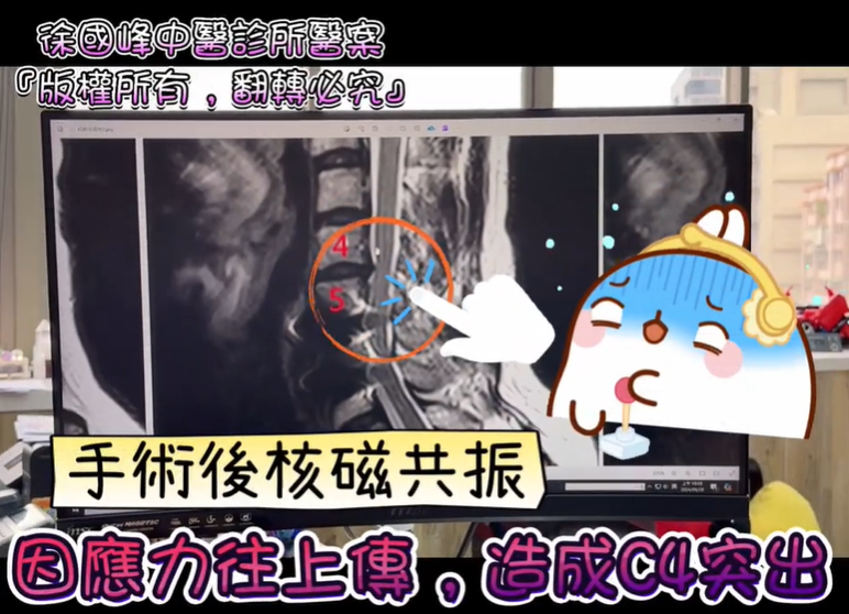 術後應力向上導致突出,上舉出現手無力,#頸椎術後沾黏合併上節突出#,歷經1個半月的密集治療👈再度逆轉