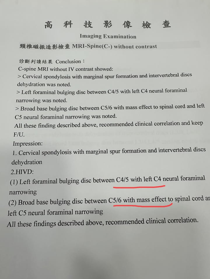 當天下午,我們立即為葉小姐安排了核磁共振檢查,整個過程順利完成。核磁共振影像顯示,葉小姐的第四、五節、第六節頸椎間盤突出,確實壓迫到了周圍的神經根,這就是她雙手麻木和肩膀疼痛的主要原因。放射科主任在之後出具的判讀報告後,我開始詳細地向我們解釋了她的壓迫情況,並建議儘早進行治療。