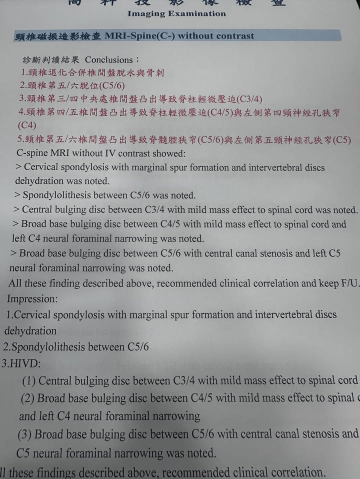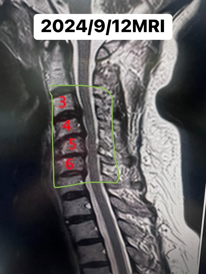 2024/9月12日,林阿姨懷著一絲期待,來到了我們的門診。那天,她雙手輕輕顫抖,語氣卻堅定地說:「徐醫師!我還想為家人煮飯,我不想成為他們的負擔。」我們醫療團隊被她的話深深觸動,決定盡全力幫助她。經過詳細問診與檢查,我們立即安排了核磁共振(MRI)。檢查結果並不樂觀——她的頸椎壓迫範圍涵蓋三節,其中三四節跟五、第六節最為嚴重,不僅滑脫,還合併椎間盤突出及神經孔狹窄。這些問題如同一道道枷鎖,牢牢束縛著她的生活。