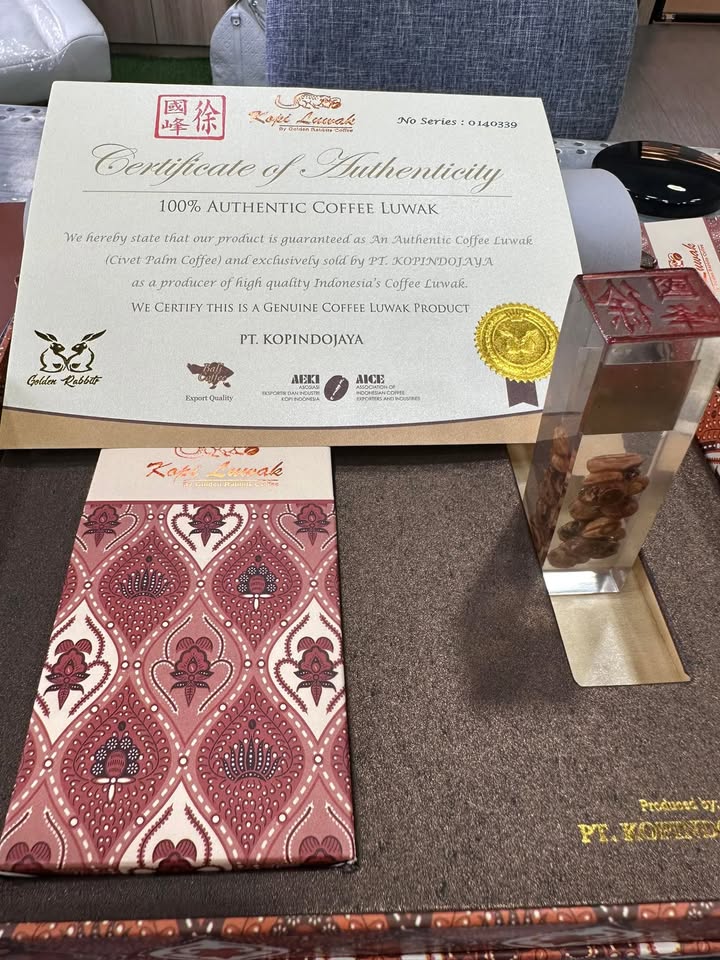 PS. Kopi Luwak是印尼語,Kopi意即咖啡,Luwak意即麝香貓(civet)。麝香貓咖啡亦俗稱貓屎咖啡。它是在麝香貓吃完咖啡樹的果實(coffee cherry)後,因果實中央的種子(咖啡豆,coffee bean) 不能被消化,所以在牠的腸道中經腸道的細菌提供獨特的發酵過程後而排出體外。排出時仍由羊皮紙(或稱內果皮,parchment)包裹住,再經過清洗乾淨、曬乾,成為了咖啡生豆(green bean),然後烘培,就成了麝香貓咖啡。而正因為它的發酵過程和平常人工處理的發酵過程不一樣,所以產生獨特的口感和醇厚度,也降低了咖啡的苦澀味.