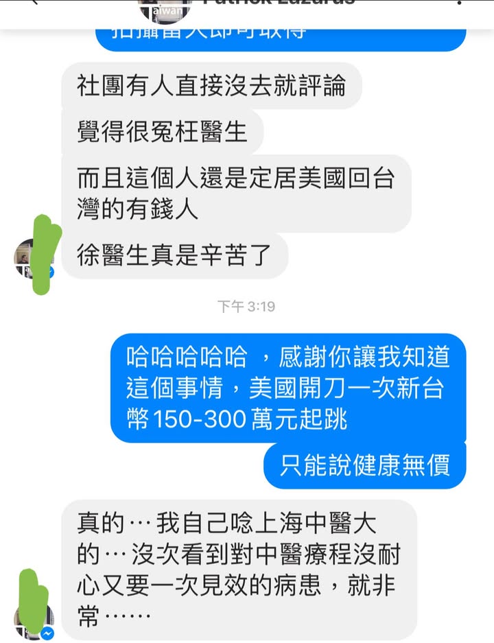 粉絲私訊問,在某個私人椎間盤治療社團,有疑似想來求醫的患者,人都還沒來診所評估,就發表中醫師是不是忘了濟世救人?還點名是不是太貴了,患者去查閱了該人的臉書公開資料,發現可能為定居美國回台的台灣同胞,最後還安慰我辛苦了😂