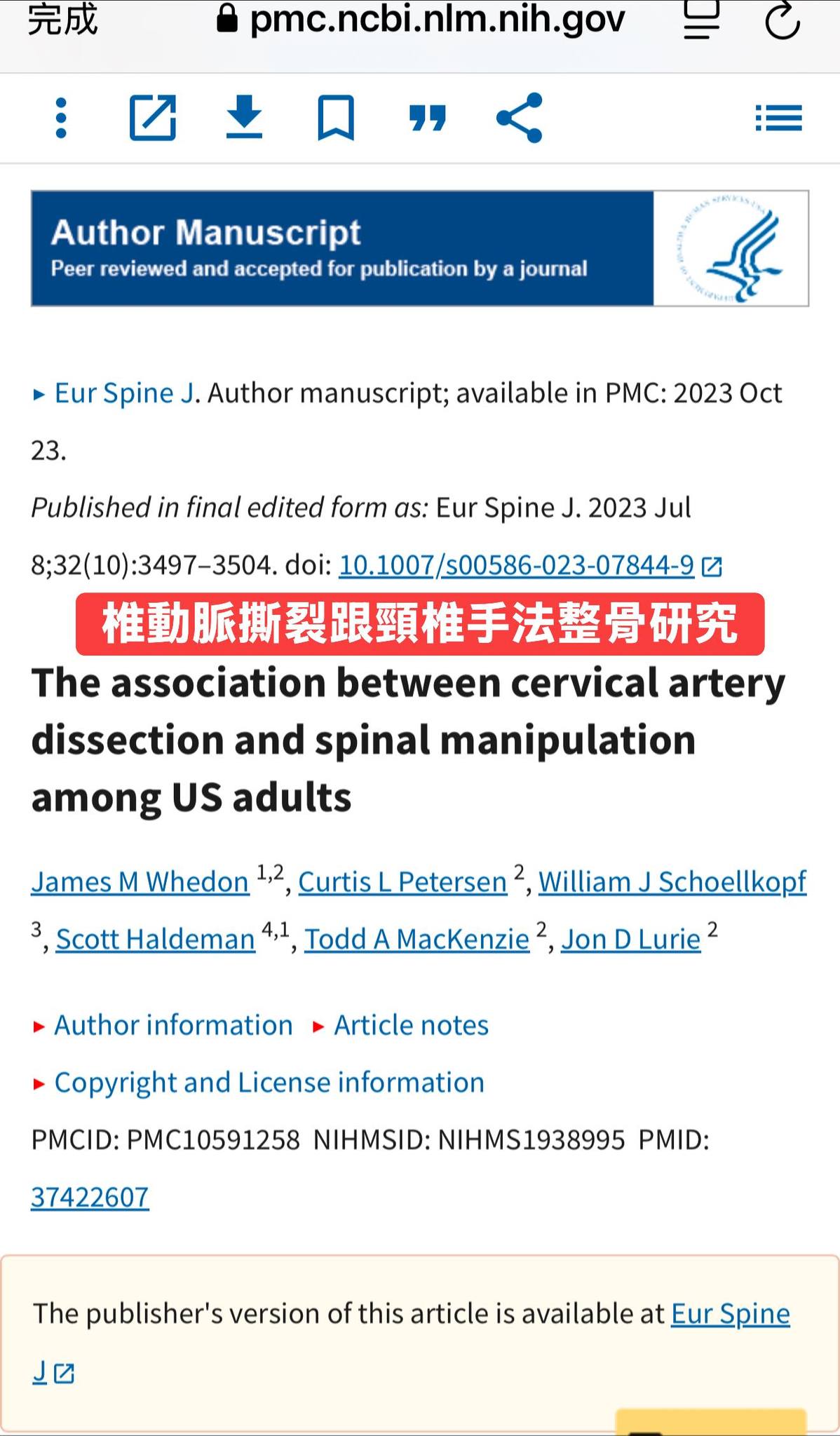 《BMC Musculoskeletal Disorders》曾報導一位患者在脊椎手法後發生頸椎硬膜外血腫,導致急性脊髓壓迫,最後需緊急手術治療