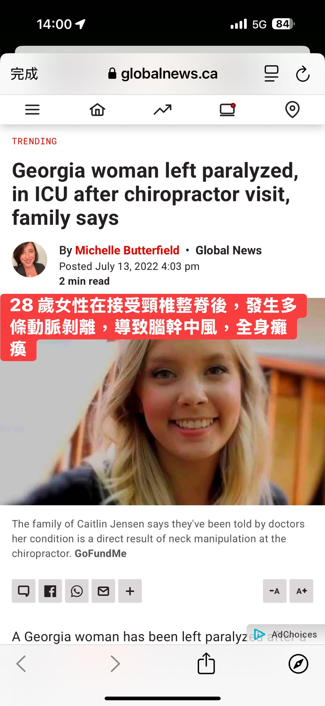 28 歲女性在接受頸椎整脊後,發生多條動脈剝離,導致腦幹中風,全身癱瘓。她的母親至今仍持續照顧她,成為國際媒體廣泛報導的悲劇。